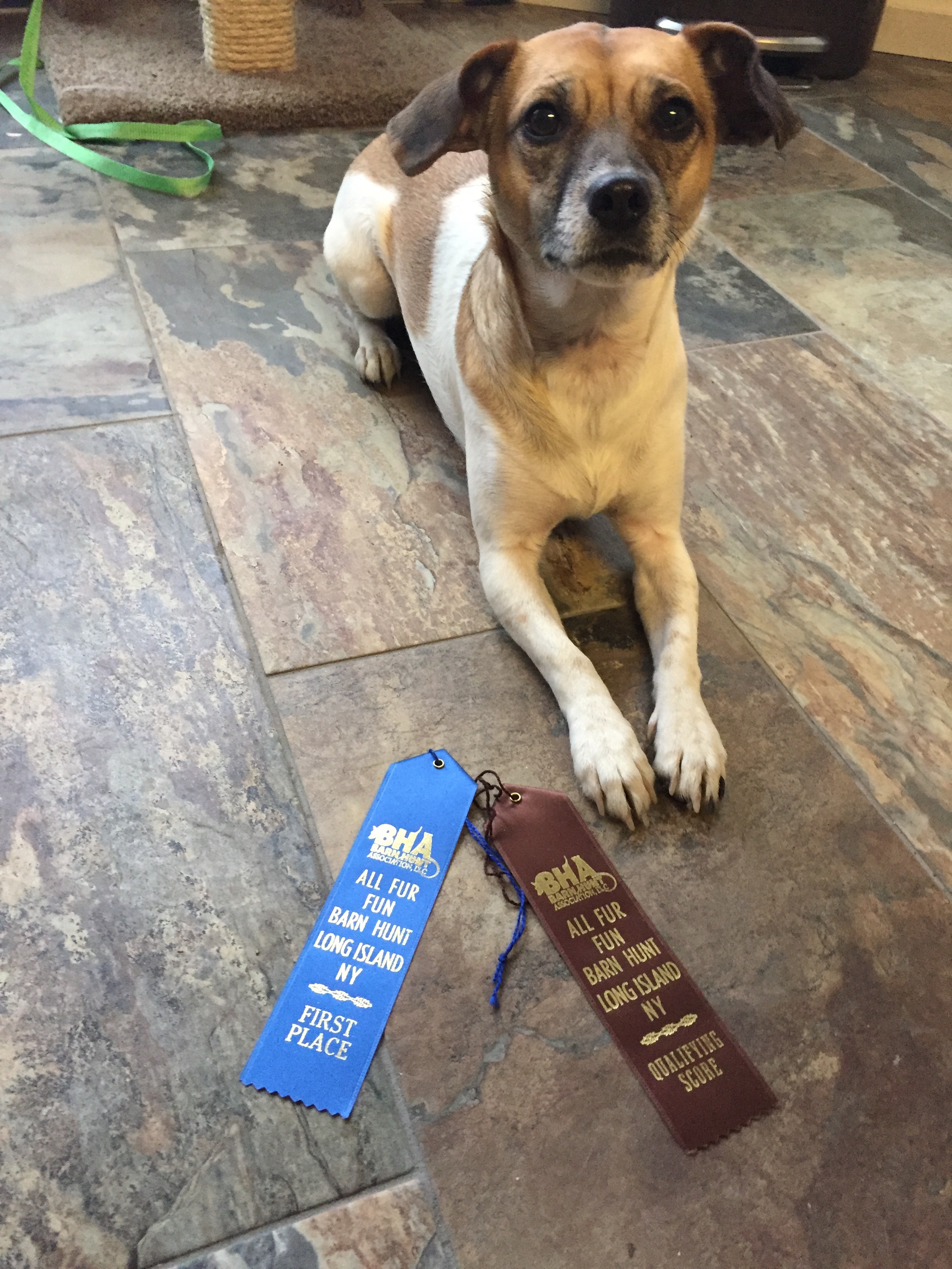 Our trainer’s dog was involved in agility and something called “Barn Hunt.” He gave us the name of the trainer for both, a woman by the name of Jean Jacobson who happened to be the founder and president of the AFFA Barn Hunt Association here on Long Island. Our trainer described Barn Hunt as a sport in which a dog enters a barn filled with bales of hay. Somewhere in the hay a rat is hidden. (The rats are in an safe and comfortable aerated tube). Dogs have two minutes to “find the rat!” Of course, for most dogs that is the easy part. The hard part is knowing your own dog’s personal “tell.” Once you believe your dog found the rat, you have to call it by saying “Rat!” If you’re wrong, you’re disqualified. If you are correct, then where you place in the competition is based on time against all the other dogs competing.