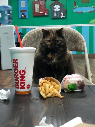 The only cat on the list—Brindle, a long-haired tortie–came to Hounds Town – Port Jefferson through Last Chance Animal Rescue. Hounds Town owner Marianne Carrano Deszcz agreed to house the cat in her lobby, hoping that one of her customers would adopt the stern-looking feline. As time went by, Deszcz realized that whenever she let Brindle out of the cat room, the cat had zero interest in leaving. She had no desire to go in the back with the dogs or outside. She was content to sit on the counter for the entire day. Deszcz herself was pregnant when cat boarding - port jefferson - bergenBrindle first arrived, and the cat spent many hours sitting on her pregnant belly. Five years later, Brindle remains unfazed by dogs and cats and pretty much everything except people food (which she adores). Most days you can find Brindle living happily on her counter at Hounds Town – Port Jefferson, almost smiling.