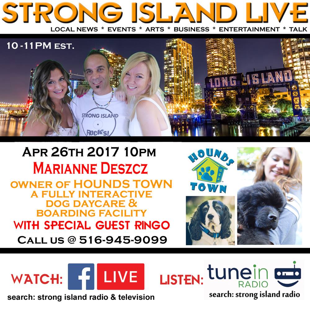 This Wednesday night @ 10 p.m. on Strong Island Live is all about the dogs with guest Marianne Carrano Deszcz, owner of Hounds Town Port Jefferson-a fully interactive dog daycare and boarding facility in Port Jefferson, NY. Furry guest and Hounds Town USA mascot Ringo will be in the studio live and they’ll be answering questions on what goes on at doggie daycare, what a day is like, and what it’s like to own a doggie daycare facility. Hounds Town USA has been in business for more than 15 years–tune in to learn more about what we do, why we’re different, and generally, just why we ROCK! Give us a ring live in the studio at 516.945.9099.