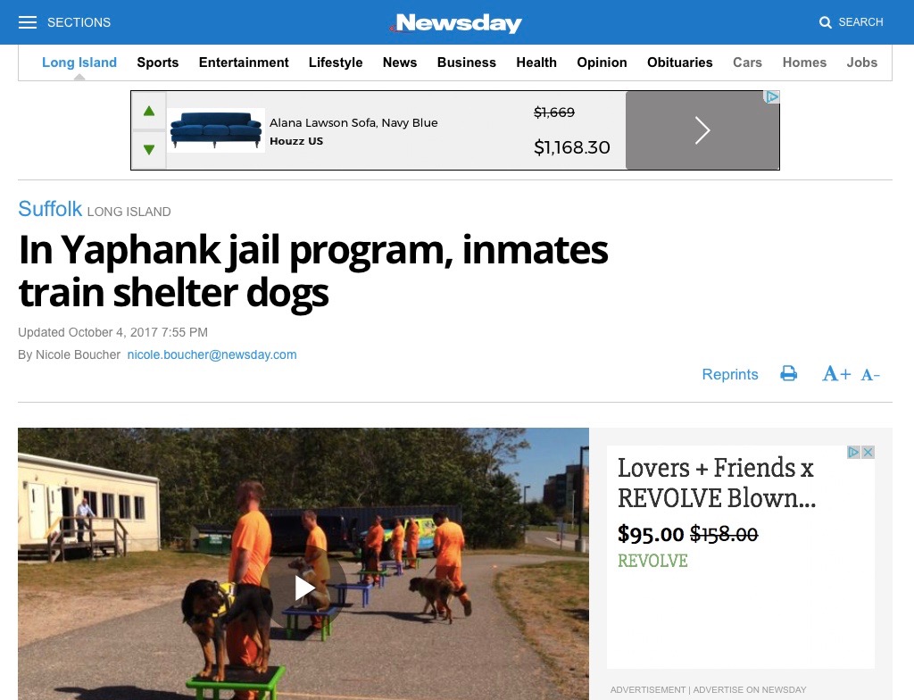 Check out the great coverage the dogs and inmates received by clicking here to read Newsday’s article and watch the video about the program. All six dogs will be up for adoption after graduation on October 22nd. Contact the Brookhaven Town Animal Shelter @ 631.451.6950 to adopt these loves.
