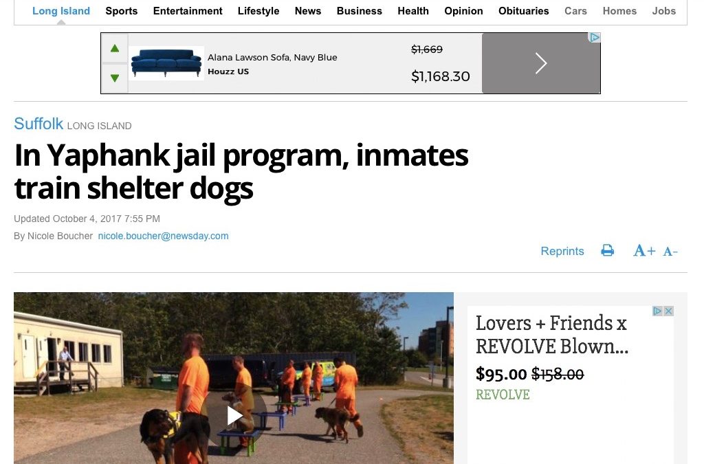 Check out the great coverage the dogs and inmates received by clicking here to read Newsday’s article and watch the video about the program. All six dogs will be up for adoption after graduation on October 22nd. Contact the Brookhaven Town Animal Shelter @ 631.451.6950 to adopt these loves.